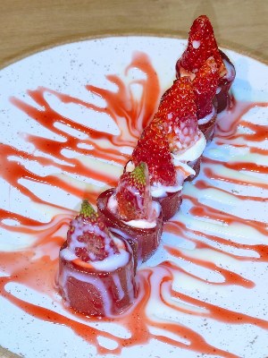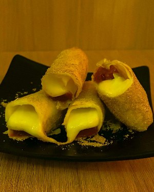 queijo e goiabada envoltos por massa harumaki frito, com canela e açúcar