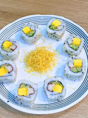 URAMAKI CALIFORNIA ALACARTE 8 UNID Enrolado com alga invertida,com recheio de manga,kani kama e pepino |