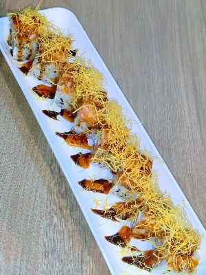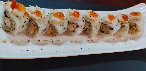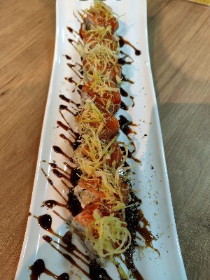 URAMAKI CAMARÃO ESPECIAL ALACARTE 8 UNID Enrolado com alga invertida,com recheio de camarão empanado e cream cheese,alface.Coberto com uma fatia extra de salmão ,crispy de batata doce e molho especial( geléia de pimenta) |