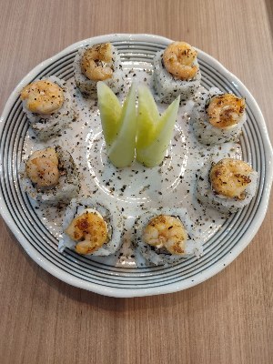 URAMAKI BOSTON MAKI ALACARTE 8 UNID Enrolado com alga invertida,com recheio de camarão,maionese,pepino e cebolinha |