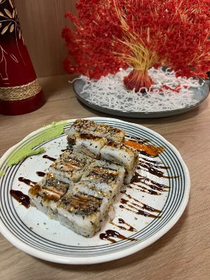 URAMAKI SKIN ALACARTE 8 UNID Enrolado com alga invertida,com recheio de pele de salmão grelhada e molho tarê |