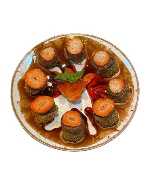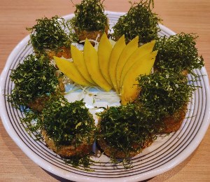 HOT FIOMAKI 8UNI À LA CARTE Sushi empanado com salmão ,cream cheese e cebolinha coberto com crispy de couve com molho tarê |