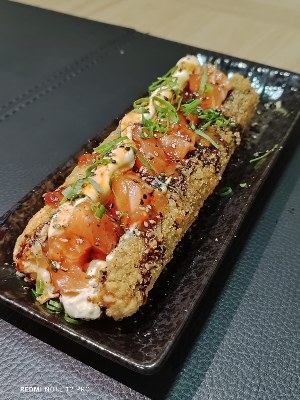AA NOVIDADE!! BIG HOT Hot roll empanado com arroz e nori, recheado com salmão cru e cream cheese, coberto com molho tare, geleia de pimenta e cebolinha. |