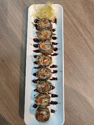 HOT PORTO ASIATICO 8UNI À LA CARTE Sushi empanado com massa especial,recheado com salmão,camarão,kani e cream cheese, molho tare e geleia de pimenta.