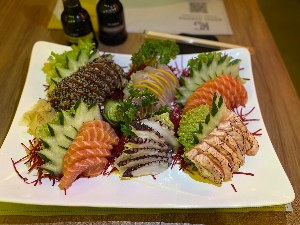 SASHIMI SUPER 10 fatias de salmão ,5 de tilápia,5 polvo,5 de salmão contemporâneo ,5 de salmão black |