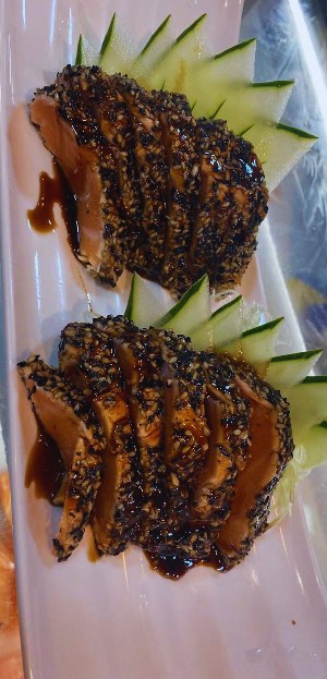 SASHIMI DE SALMÃO GOMAYAKI 10 fatias de salmão selado no gergelim |