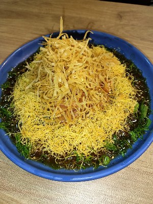 Cubos de salmão marinado com molho de ostra com crispy de massa especial e crispy de batata doce