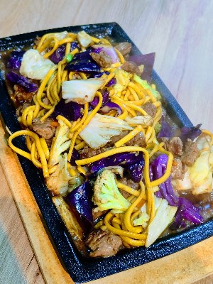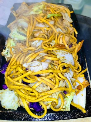 YAKISOBA NA CHAPA CARNE ALACARTE Com legumes e macarrão refogado no tacho.Serve de 2 a 3 pessoas |